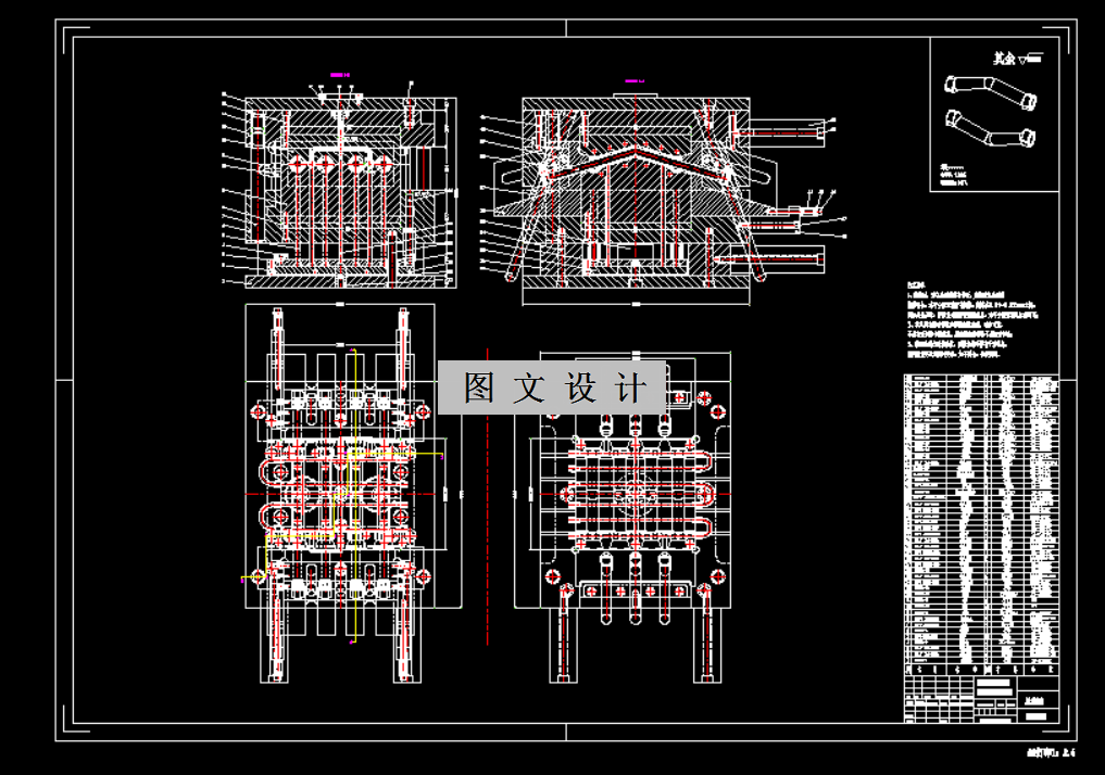 异形管接头注塑模具设计,采用一模四腔、侧浇口形式,两板模结构稳定可靠。斜导柱滑块抽芯机构确保复杂结构成型精准。此设计提升生产效率与制品质量,适用于大批量、高精度的异形管接头生产。