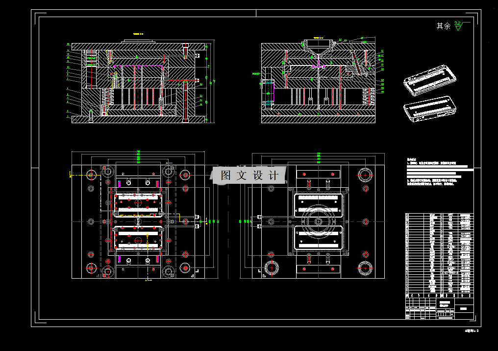 音乐盒底座模具设计采用一模两腔结构,侧浇口进料,大忌嘴形式有效节省废料。模具内嵌斜导柱滑块抽芯机构,确保复杂结构顺利脱模。推杆顶出设计提高生产效率,保证底座尺寸精度与外观质量。整体设计合理,适用于音乐盒底座的大批量生产,提升生产效率与成本控制。