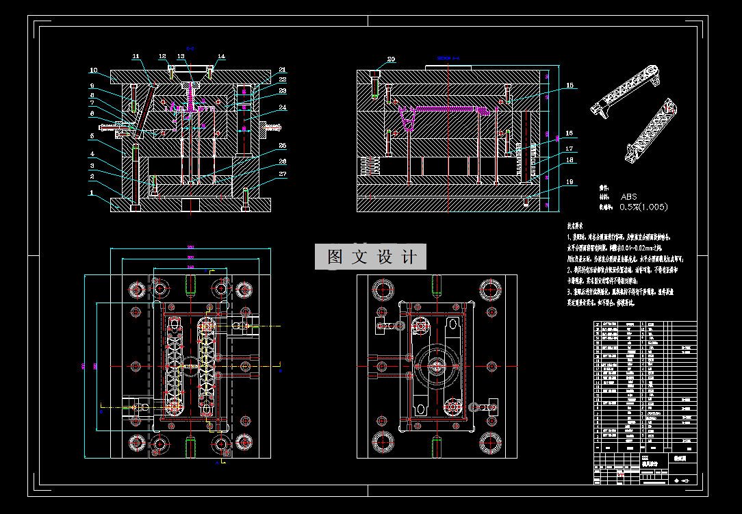 四旋翼飞行器关键零件模具设计,采用一模两腔结构,提升生产效率。斜导柱滑块抽芯技术,确保复杂结构零件精准成型。两板模结构简洁,操作便捷。推杆顶出机构,保证零件平稳脱模。整体设计精密高效,满足无人机零件的高品质生产需求,确保四旋翼飞行器的性能稳定。