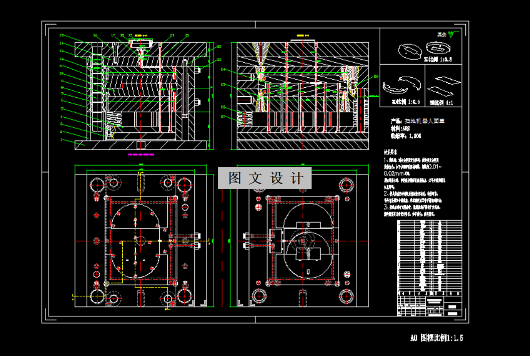扫地机器人面盖注塑模具设计,采用三板模结构,一模三腔1+1+1布局提升生产效率。模具使用点浇口转侧浇口形式,确保塑料流动均匀。推杆顶出机构稳定可靠,整体设计满足扫地机器人面盖的精度和强度要求,确保高质量产品输出。