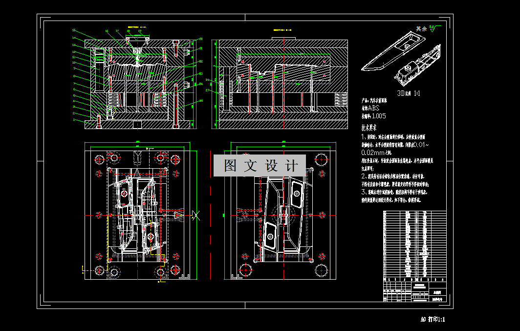 汽车右前面板注塑件模具设计,采用一模两腔结构,侧浇口进料,两板模设计。模具内嵌斜推杆抽芯机构,