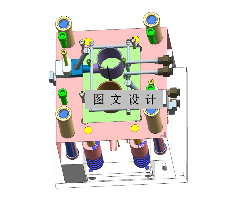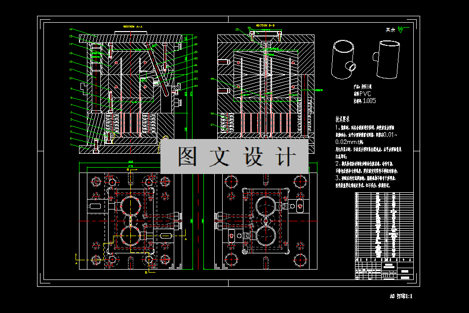 异径三通注塑模具设计,采用一模两腔结构,侧浇口进料,两板模设计,结合斜导柱滑块抽芯机构,确保模具开模顺畅,产品脱模容易。该设计配备爆炸图,详细展示模具组件,便于理解和制造。整体设计科学,结构合理,满足异径三通管件的生产需求。