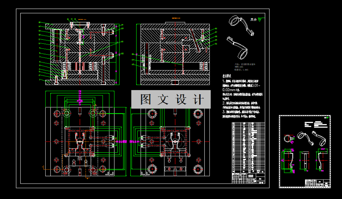 洗衣机排水管卡注塑模具设计,采用一模两腔结构,侧浇口进胶,两板模设计,确保生产效率与品质。斜导柱滑块抽芯机构,实现复杂结构精准成型。推杆顶出系统,确保产品顺利脱模。整体设计合理,工艺成熟,满足洗衣机排水管卡的生产需求。