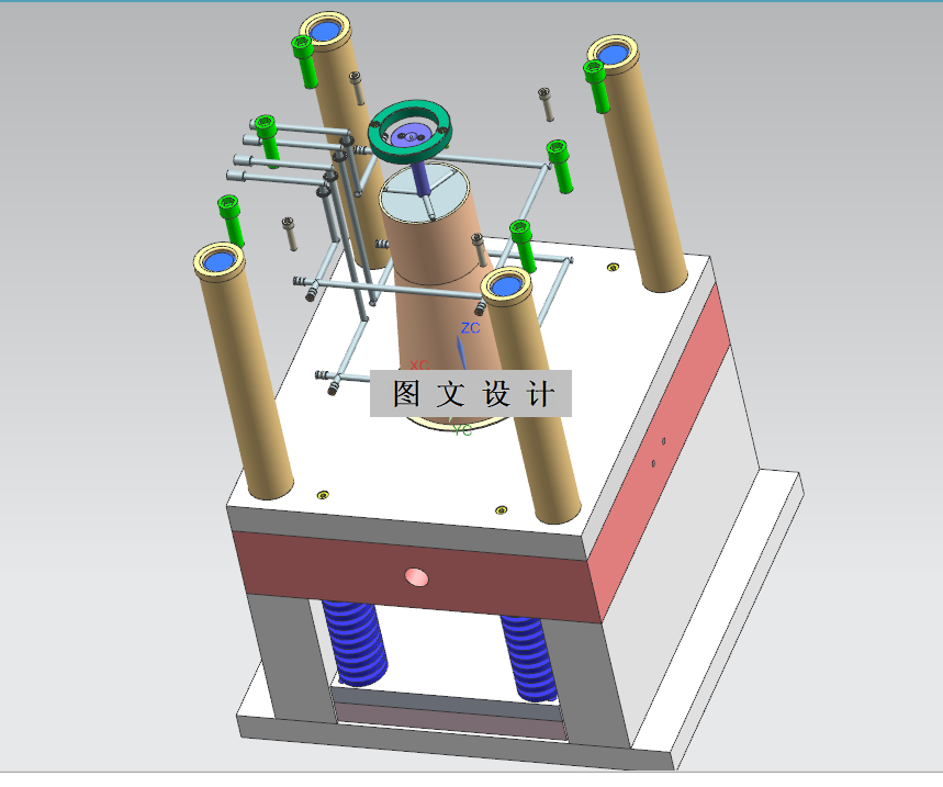 圆形筒注塑模具设计,一模一腔确保制品精度,三点Y字形进胶保证塑料填充均匀,推杆顶出机构实现顺利脱模,两板模结构简化操作,整体设计稳定高效,满足圆形筒高质量注塑生产需求。