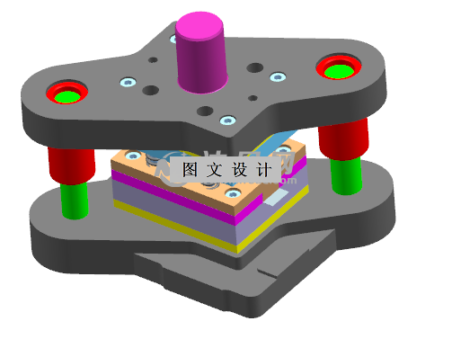 选用了高精度等级的对角导向滑动导柱模架,运作平稳无偏斜; 设计了弹压导板导向结,对凸模进行导向,保护细小凸模,提高导向精度; 采用有沿边、有搭边、中间载体送料的排样方式,增大带料的刚度; 使用双侧刃对称布置定距、双侧导料板导向的定位方式; 加大小尺寸凸模固定端的尺寸,提高其强度和刚度; 设计了镶拼结构的凹模,降低加工难度,便于刃磨和维修; 采用弹性卸料装置,卸料可靠、安全,能确保送料顺畅,提高生产率,冲压前有压料作用,可使制件和带料平直,防止弯曲过程中带料的偏移,减少回弹。