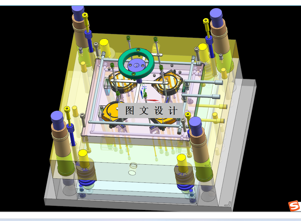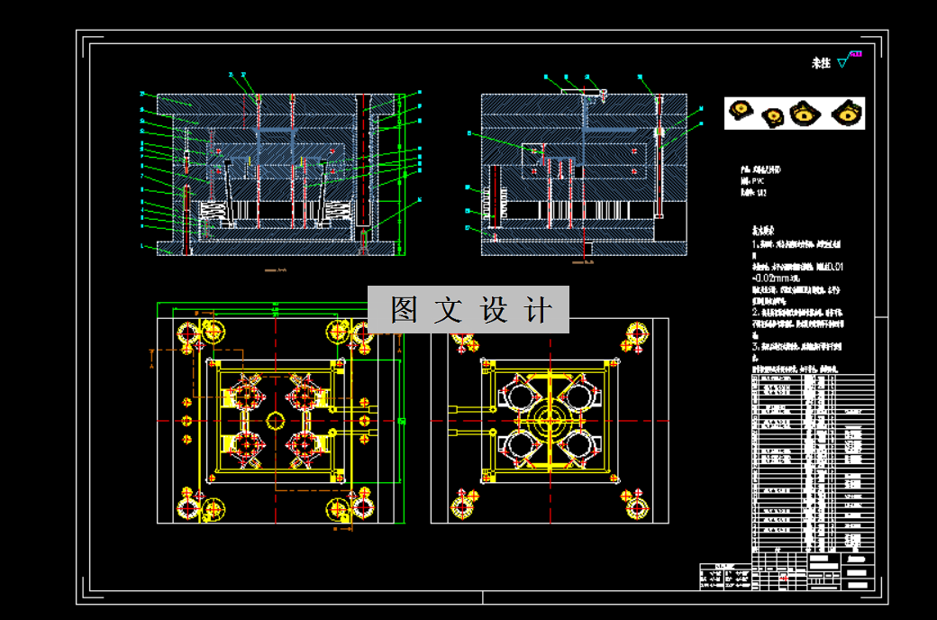 根据塑料制品的要求,了解塑件的用途,分析塑件的工艺性、尺寸精度等技术要求,考量塑件制件尺寸。本模具采用一模四腔,点浇口进料,注射机采用DM450D双色注射机型号,设置冷却系统,CAD和UG绘制二维总装图和零件图,采用moldflow模流分析软件,对完成后的注塑模具进行注塑充填模拟,生成模拟仿真动画与详细的模流报告。最后附上说明书,系统地运用简要的文字,简明的示意图和和计算等分析塑件,从而作出合理的模具设计。