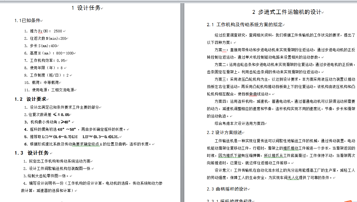 4. 编写设计说明书一份(工作机构的设计计算,电动机的选择,传动系统和动力参数计算,减速器的选择和计算)