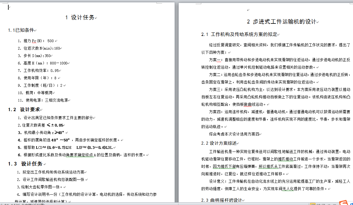 4. 编写设计说明书一份(工作机构的设计计算,电动机的选择,传动系统和动力参数计算,减速器的选择和计算)