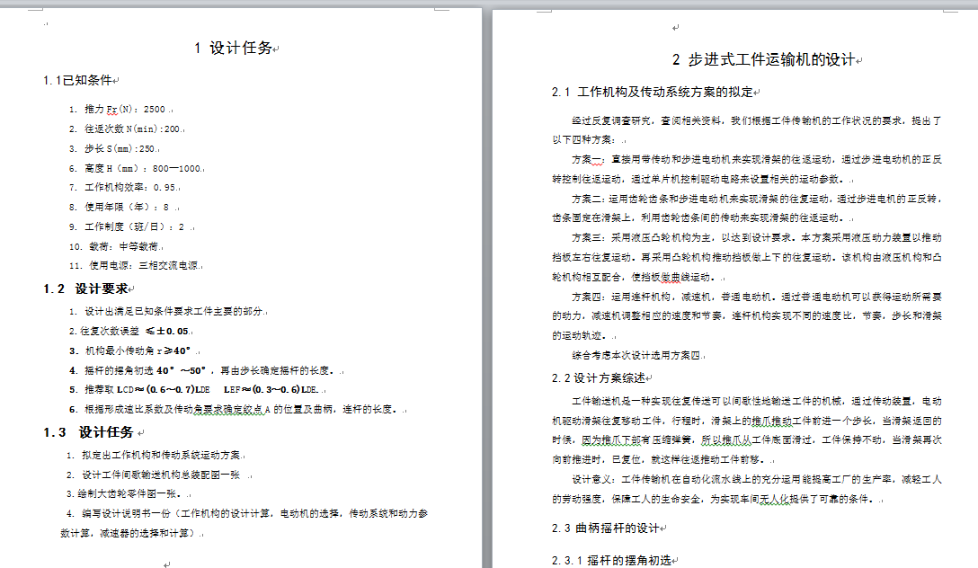 4. 编写设计说明书一份(工作机构的设计计算,电动机的选择,传动系统和动力参数计算,减速器的选择和计算)