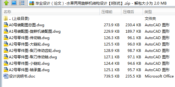 水旱两用旋耕机具有体积小,重量轻,性能好,操作容易,转动方便,适应性广,价格合宜,水旱两用旋耕机机动灵活,一般中小型机械厂、农机厂均可生产制造的要求。如果设计成功,本机可进行旱田旋耕、水田耙整等项作业,能弥补现有旋耕机存在功能较单一、生产效率偏低等不足之处。我设计的是一台水旱两用旋耕机,与黄海-12(15)马力手扶拖拉机相匹配,主要用于水田耕整,也可进行旱田耕作。现有的水旱旋耕机是耕幅为0.6米的老式机型,而本课题设计的水旱旋耕机耕幅为1米。本设计与黄海-12(15)马力手扶拖拉机相匹配,中间传动,固定联接。设计内容包括机架、传动系统、刀辊、尾轮等,要求结构简单、紧凑、重心平衡。该机可用于水田耕整地,也可进行旱田旋耕。各项性能指标应达到国家标准和农艺要求。 通过对水田旋耕机驱动轮与土壤相互作用的力学特性的分析,结合水田土壤的力学性质,经过优化设计,研制水旱两用旋耕机驱动轮,使该驱动轮具有良好的动力性能。
