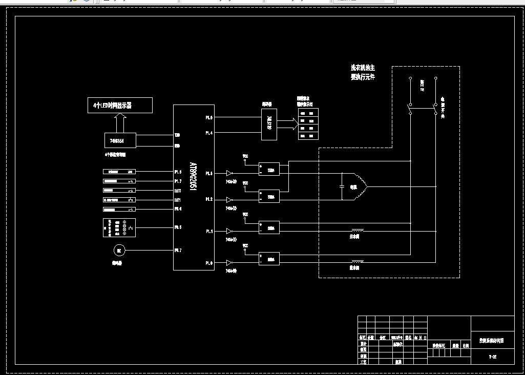 本系统的电路并不复杂,给AT89S51单片机载入软件程序后,能够实现全自动洗衣机的基本功能。虽然不能与电器市场上的洗衣机控制系统媲美,但也具有一定的实用性。