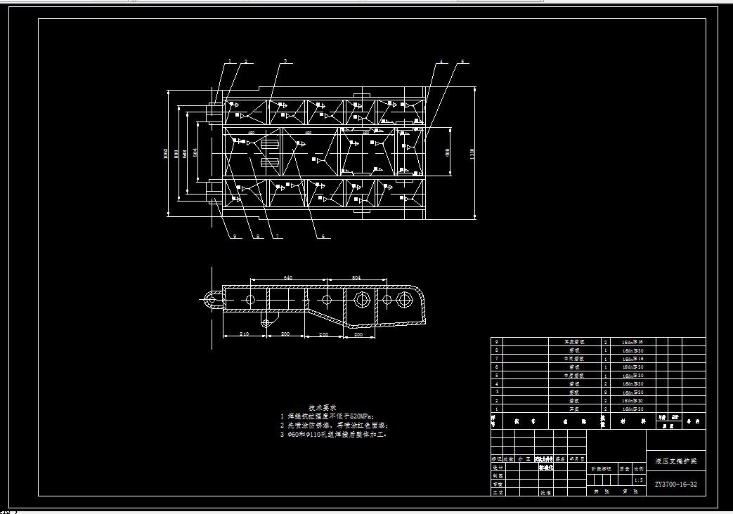 支架采用正四连杆机构,以改善受力状况。顶梁、掩护梁、底座等均做成箱体结构;立柱采用带双伸缩双作用液压缸,以增加工作行程来满足支架调高范围的需要;推移千斤顶采用框架结构,以减少推溜力和增大移架力。校核按弯曲应力进行计算。液压支架与可弯曲输送机和采煤机组成综合机械化采煤设备,它的应用对增加采煤工作面产量、提高劳动生产率、降低成本、减轻工人的体力劳动和保证安全生产是不可缺少的有效措施。