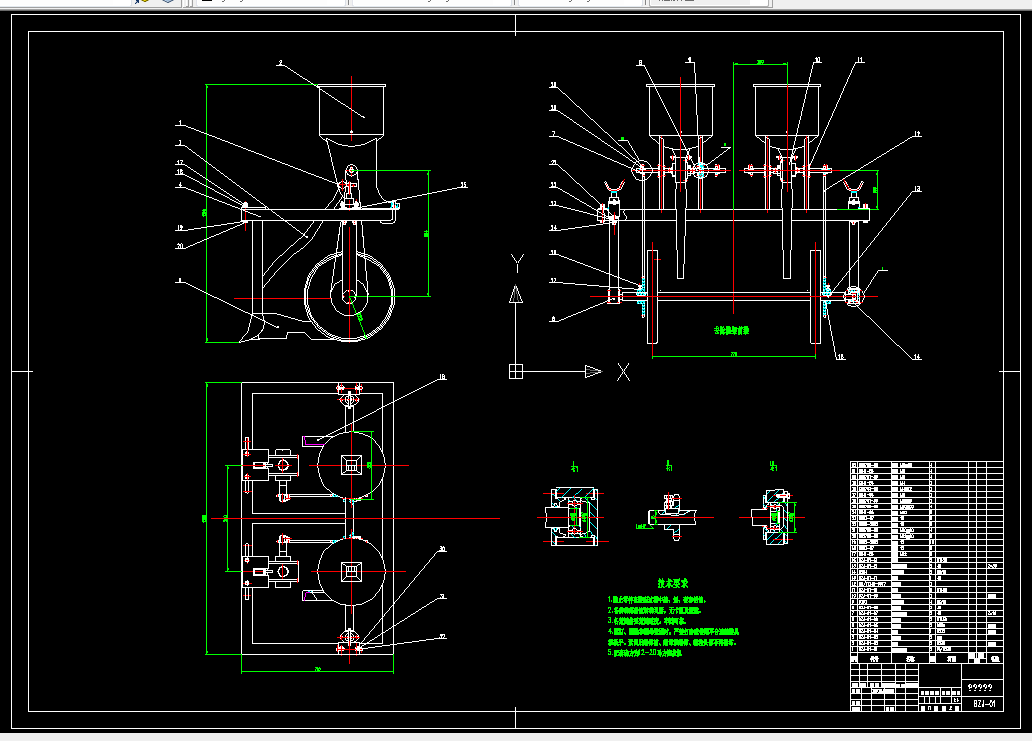 本设计是根据国内外播种机的发展趋势,通用性和适应性不断提高以及本着结构简单操作灵活的原则,而设计的一种能同时完成播种、施肥、撒水、覆土、镇压等工作的小型多功能精密播种机。此播种机适合在较面积的土地上耕种,耕种行数为2行。而且播种的株深、行距以及株距在一定的范围内是可调的。该机结构上优点,使之能适应多种田地的播种。小到1-2分大的田块,大到上百亩的田块都能适应。还可以根据用户的不同需求,配置合适的播种器。通过调节犁铧和种子储存孔的行距,能够轻松地播种棉花、高粱、大豆、玉米等旱粮作物。本例着重对播种机排种器、排肥器、开沟器、覆土器以及镇压轮等结构进行设计选择。从一定程度上大大节省了人力、物力,提高了劳动效率和质量。
