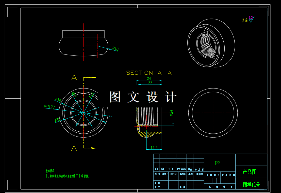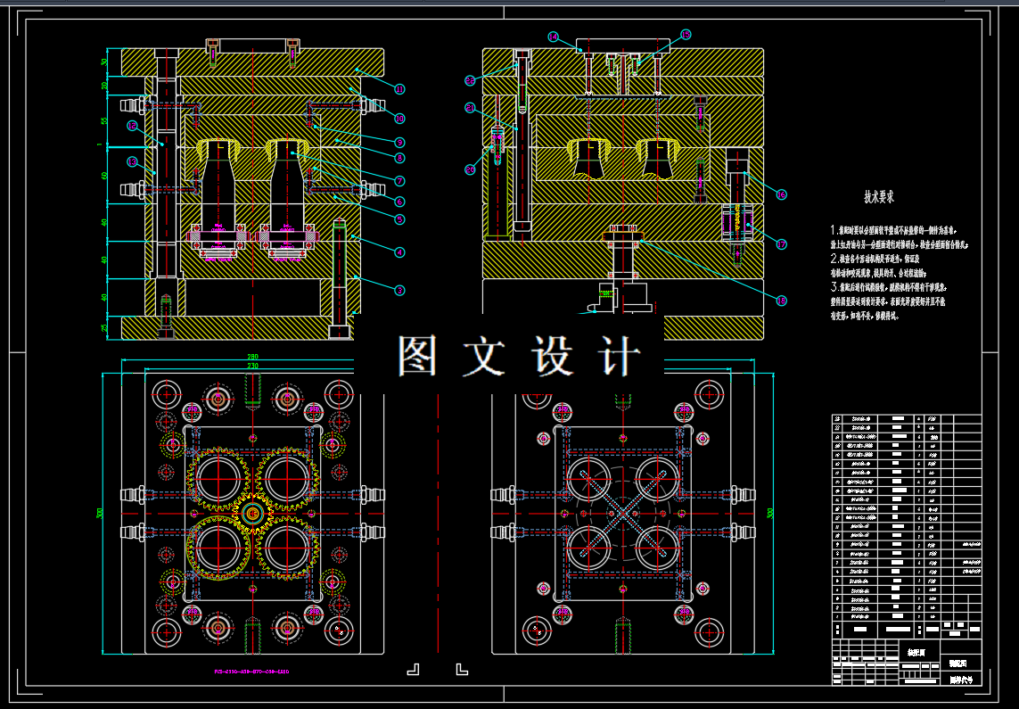 本次设计的产品为瓶盖,具有重量轻,强度高,耐腐蚀,易清洁等 特点,为大批量生产产品。本次设计在针对产品进行工艺性分析后,确定模具分 型面、 型腔数目、 浇口形式、 位置大小; 采用一模四腔,推板推出,全自动螺纹抽芯的设计方案。