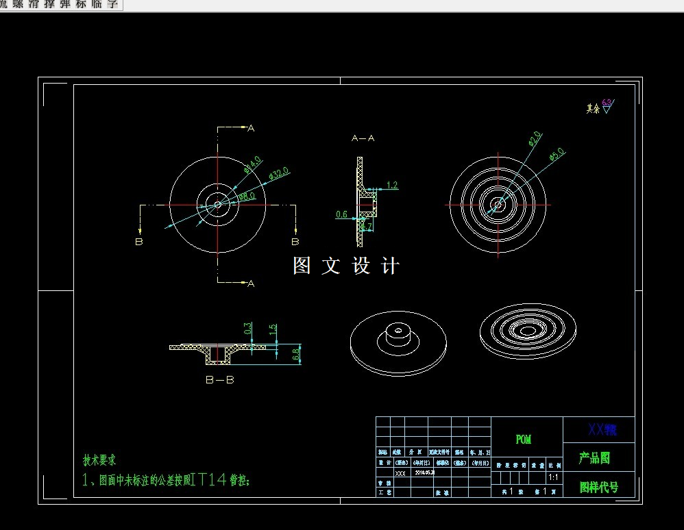 摩擦轮注塑模具设计-一模四腔点进胶方案 本文是关于摩擦轮注塑模具的设计,塑件虽然不是很复杂,但其设计的难点在于导向系统机构和浇注系统的设计。本次设计主要使用UG8.5软件,结合生产实践来设计摩擦轮注塑模具的整体结构,通过对塑件形状、尺寸等方面的分析来确定其工艺。主要包括分型面的选择,浇注系统的设计,成型零件的计算,导向系统机构的设置,顶出机构和冷却系统的设计等,此外还对其脱模力进行计算,并选择合适的注塑机。本次设计使用UG8.5,胡波外挂来进行模架、螺钉、顶杆等零件的选取,设计安装完成后,直接导出2D装配图及相关零件图,大大缩短了设计时间。 三维图 二维图 说明书 完整的一套设计方案