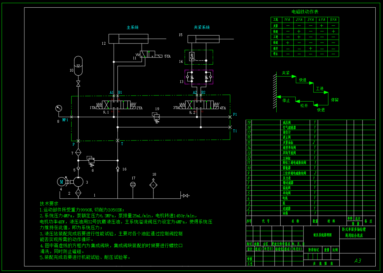 卧式单面多轴钻镗两用组合机床液压系统设计,包含液压系统原理图,负载和速度图,液压缸工况图,液压缸装配图,设计计算书。实现功能:夹紧—快进—工进—(停留)—快退—夹紧松开—停止的工作循环