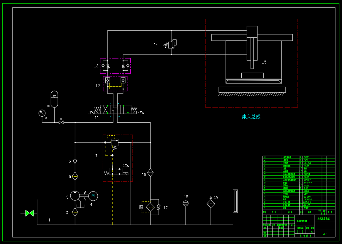 冲床液压系统设计,包含液压系统原理图设计,泵站总装配图,油缸装配图,油箱焊合图设计,包含设计计算书。 最大冲剪力:1.5kN 系统额定压力:1MPa 瞬时最大压力:3MPa 快降速度:7.8mm/s 快升速度:6.4mm/s