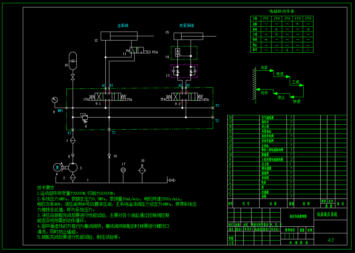 钻床液压系统设计,包含液压系统原理图,泵站总装配图,电磁铁动作表,阀块,负载和速度图,冷却器支座,液压缸工况图,溢流阀主阀芯,油箱盖,油箱焊合,钟形罩等二维CAD设计,设计计算书。
