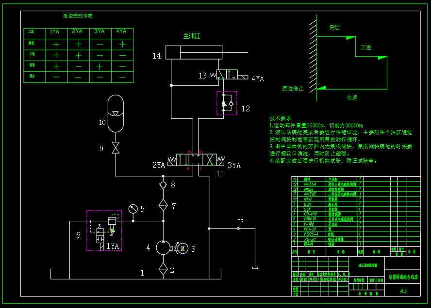 钻镗组合机床液压系统,包含液压系统原理图,液压缸装配图,速度和负载图,电气控制原理图,设计计算书等。 1、实现功能:其工作循环是:快进→工进→快退→原位停止。 2、基本参数:快进与快退速度均为5m/min=0.083m/s,工进速度为10-100mm/min=(0.00017-0.0017)m/s,最大行程为300mm(其中工进行程为120mm,快进行程即为180mm),最大切削力为30000N,运动部件总重量为25000N,启动换向时间为0.05,采用水平放置平导轨,静摩擦系数为0.2,动摩擦系数为0.1,油缸机械效率为0.9。
