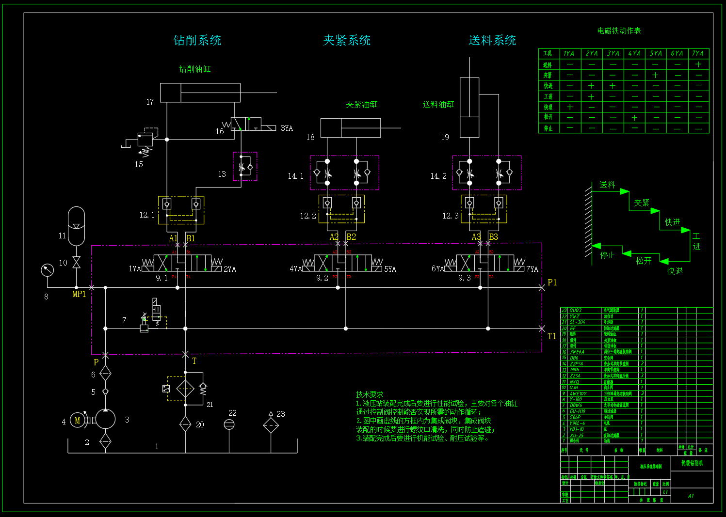 轮毂钻削机液压系统设计,包含液压系统原理图,液压泵站总装配图,速度和负载图,液压缸工况图,设计计算书等。 实现功能:送料——夹紧——快进——工进——快退——松开——停止的工作循环。