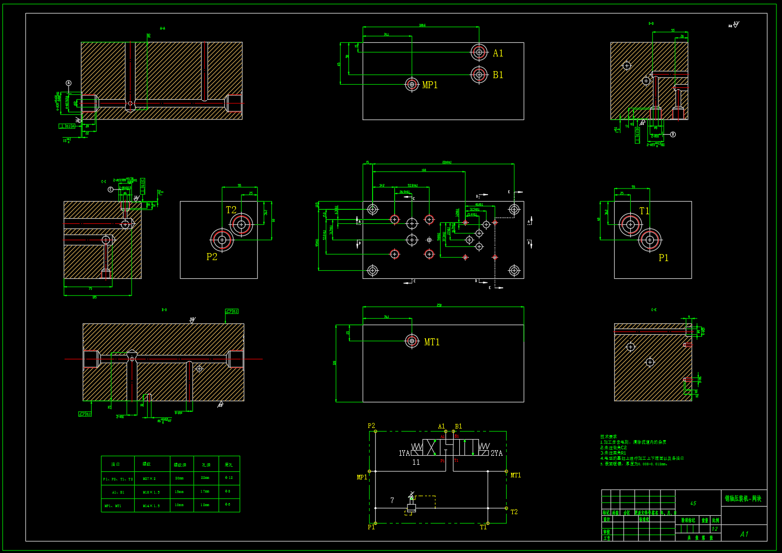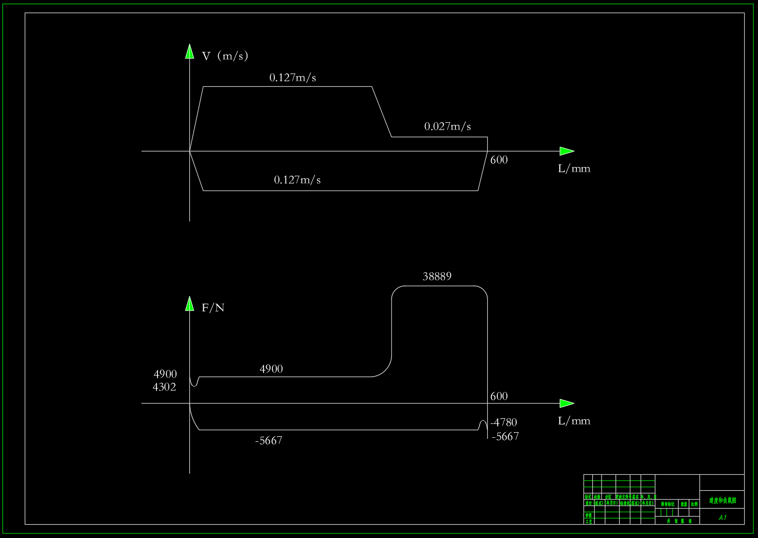 销轴压装液压机液压系统,包含液压系统原理图,速度和负载图,阀块零件图,设计计算书等。 (1)实现功能:快速下降——慢速压装——快速上升——停止的工作循环 (2)基本参数:压装液压缸最大压装力30KN,工作台运动部件重力(回程力)5KN,空载快降速度7.6m/min,快速上升速度为7.6m/min,压装工进速度为1.6m/min,最大行程总和设定为600mm,设定快速下降行程500,压装工进行程100,快速上升行程为600,不考虑摩擦力,工作台启动时间(加减速时间)0.1:,液压缸机械效率为0.9。根据导轨间隙与具体设计结构尺寸设定竖直导轨垂直正压力FN=500N;静摩擦系数fs=0.2,动摩擦