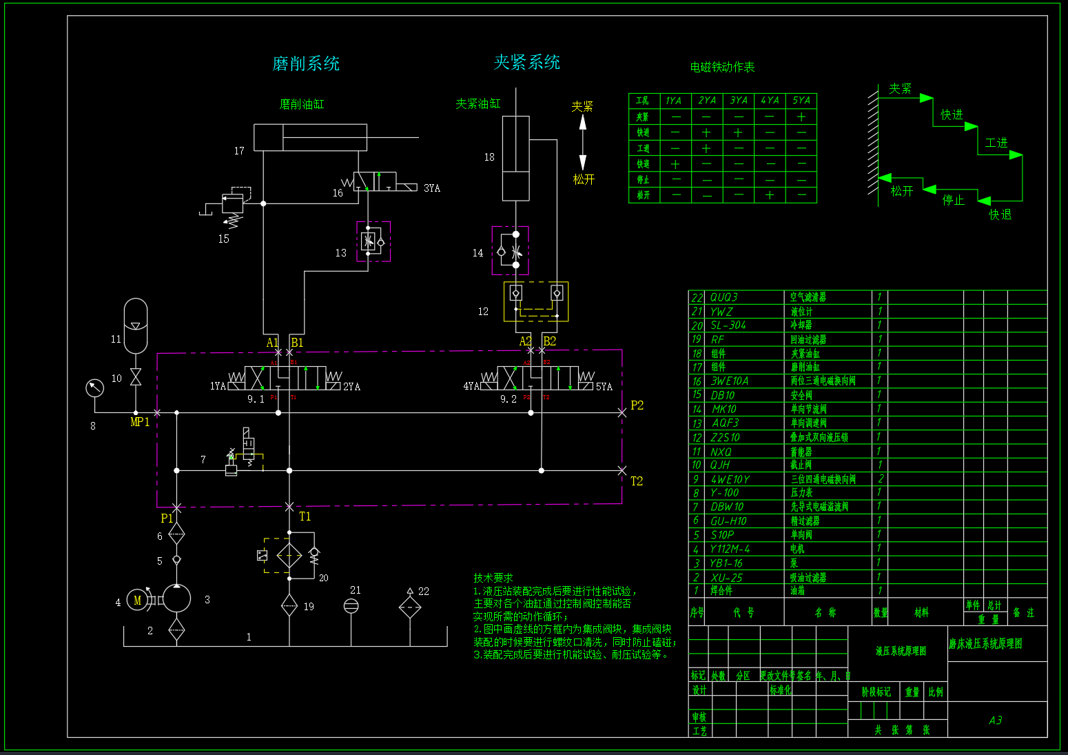 磨床液压系统(F=15KN),包含液压系统原理图,泵站总装配,电磁铁动作表,速度和负载图,工况图,换向阀阀芯,溢流阀导阀体,油缸导向套,耳环,活塞,左端盖等二维CAD图纸设计,包含设计计算书。