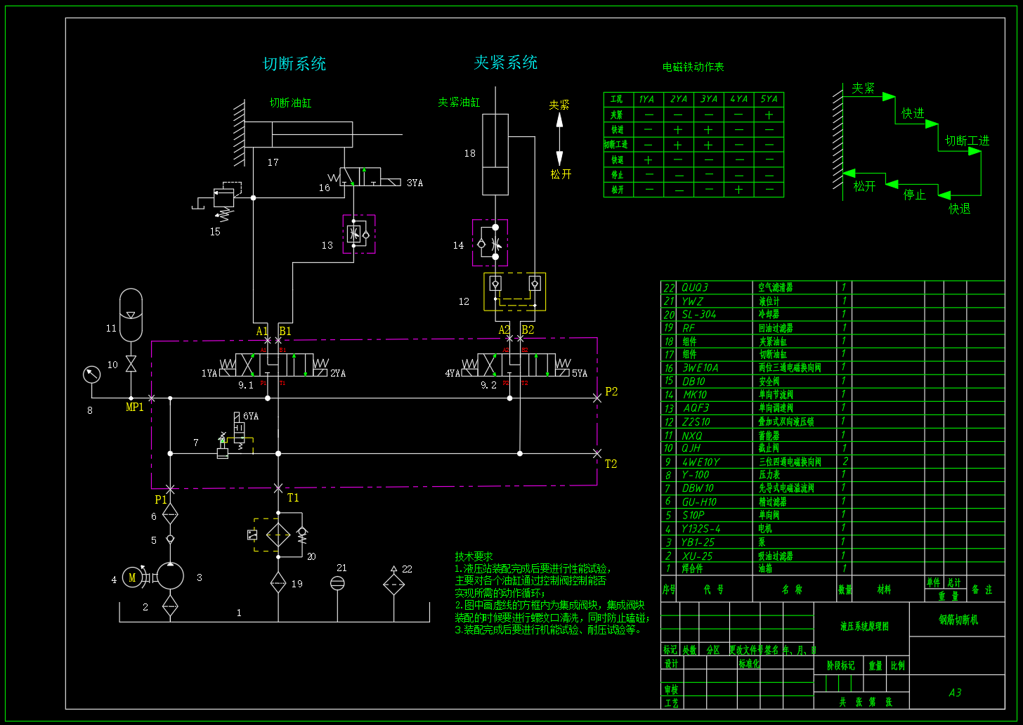 钢筋切断机液压系统,包含液压系统原理图,液压缸装配图,液压缸工况图,速度图和负载图,设计计算书。 (1)实现功能:夹紧—快进—切断(工进)—快退—停止—夹紧松开的工作循环 (2)已知基本参数:最大切断力15000N,快进负载250N,返回负载300N,快进与快退速度设定相等,均为1m/min,工作台工进速度为0.9m/min。