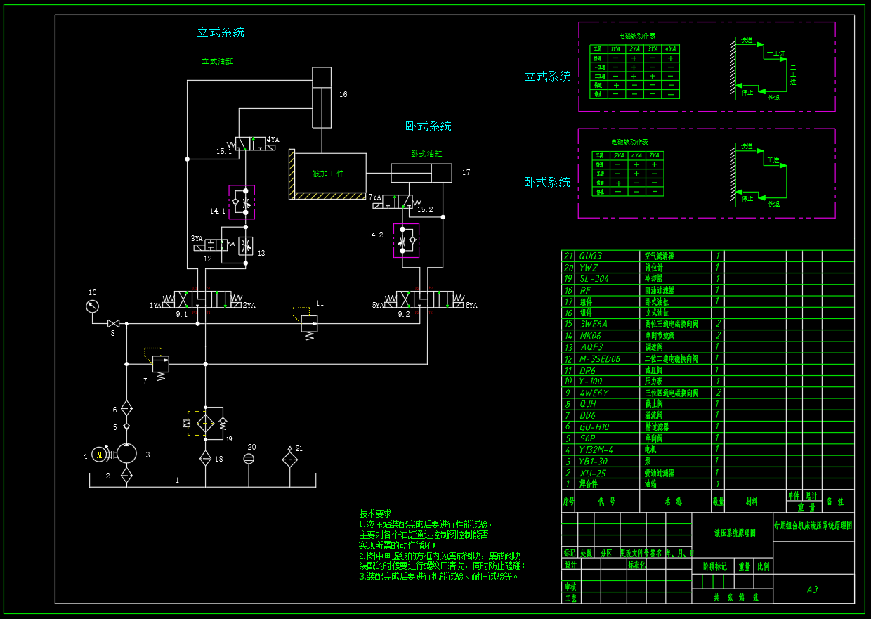 专用组合机床液压系统设计(F=11KN),包含液压系统原理图,油缸装配图,油箱组件图,油缸后盖零件图,立式速度和负载图,卧式速度和负载图,设计计算书等。动作循环: 立式:快进→工进Ⅰ→工进Ⅱ→死挡块停留→快退→原位停止; 卧式:快进→工进→停留→快退→原位停止。