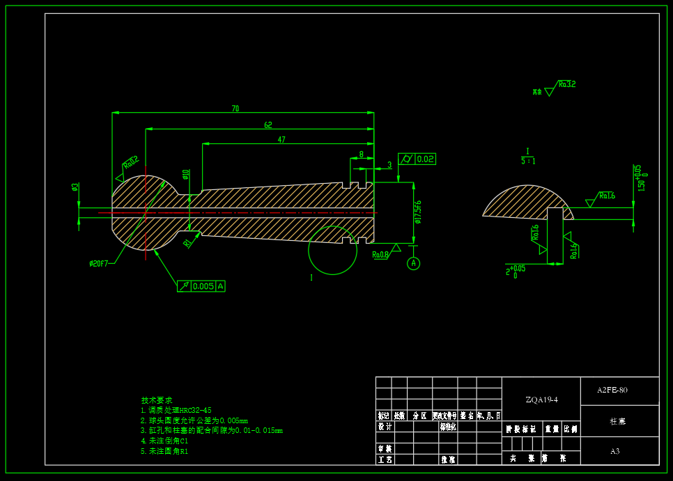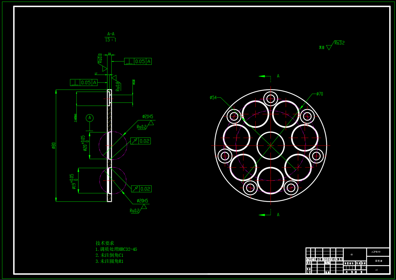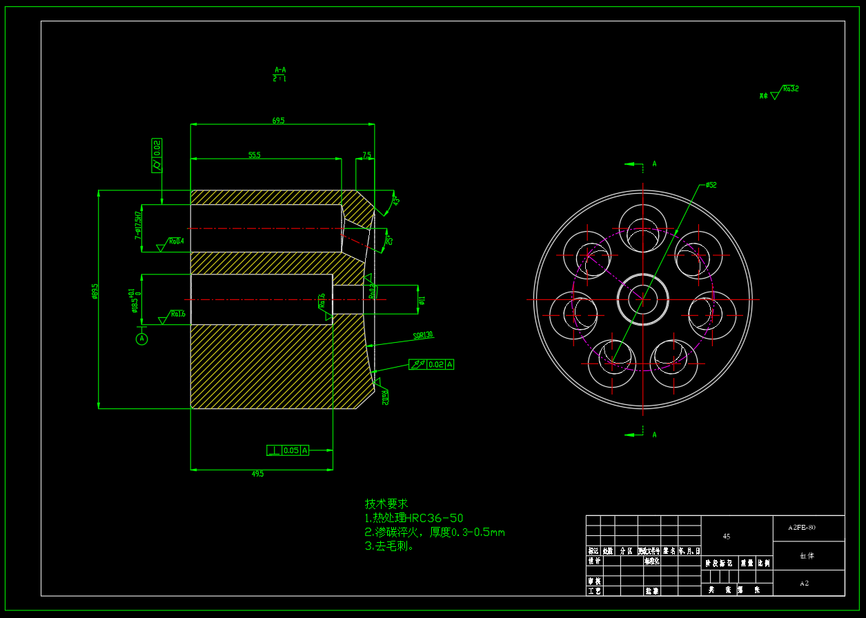 A2FE-80斜轴式轴向定量马达,包含二维总装配图,缸体、回程盘、柱塞二维CAD图,包含设计计算书。基本参数:额定压力:35MPa,额定转速:n=3350r/min,额定排量:80mL/r,最大扭矩:446N.m,类型:A2FE-80斜轴式轴向柱塞定量马达。