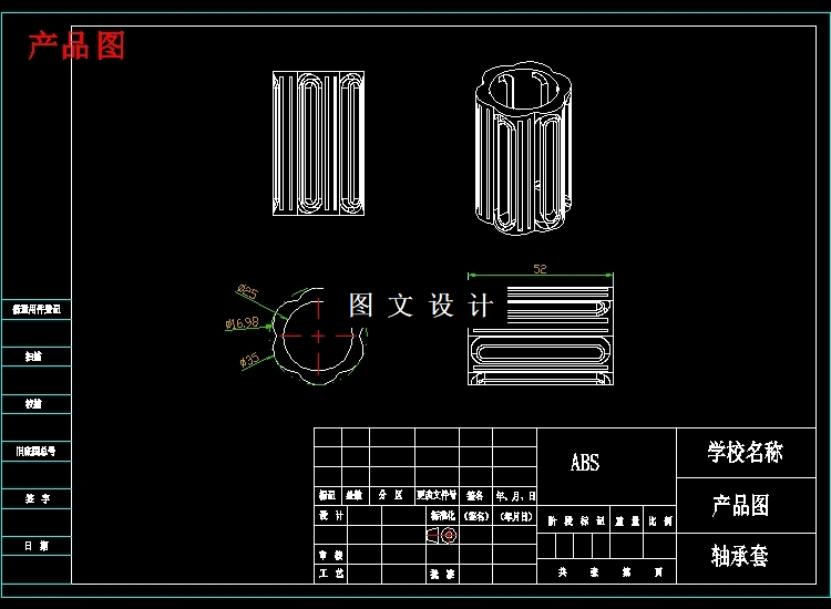 《轴承套注射模模具设计》是编写者两个月以来所编写的。主要介绍:注射模的整个过程,包括成型零部件、推出机构、流道等一些设计。在书写过程中,通过一个月的时间对原始资料进行搜集,充分考虑了模具的各种结构。