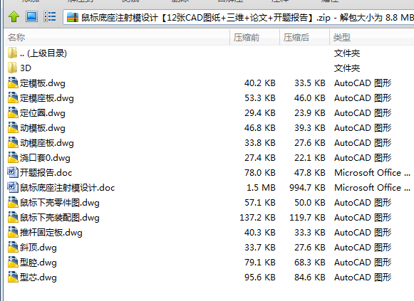 2、若题目上备注三维,则表示文件里包含三维源文件,由于三维组成零件数量较多,为保证预览截图的简洁性,本站将三维文件夹进行了打包。三维及CAD预览截图,均为本站电脑打开软件进行截图的,保证能够打开,下载原件超高清,下载后解压即可;