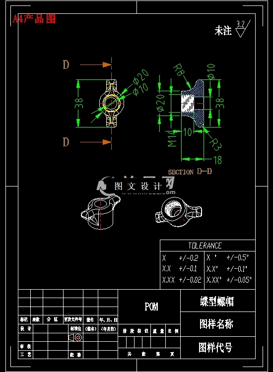 注射模具在模具行业有着很重要的地位,而注射模具的发展离不开塑料工业的发展,注射成型是热塑性塑料成型的主要方法之一。通过这种方法可以制作出复杂的塑料制品,而且一副模具一个成型周期可以同时成型多个制件,生产效率高,因而广为采用。此次设计的题目是“蝶形螺帽注射模设计”。首先,需要进行工艺分析:确定分型面,浇注系统等,选择注射机,计算成型零部件的尺寸,确定是否采用冷却系统。然后进行结构设计:确定模架以及导向机构、紧固件选取、脱模机构设计等等。最后对模具结构与注射机的匹配和重要尺寸进行校核。此次设计要保证满足工艺要求和结构要求。