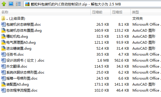 本设计详细阐述了集PLC技术,光电感应技术,通信技术于一体的先进控制技术在该包装机控制系统中的应用。 通过对小型全自动颗粒料包装机工艺过程的分析 ,克服了传统小型包装机传动方案的缺陷 ,提出了PLC控制的柔性化包装机的构想。设计工作的任务包括包装机构和运动分析,控制部分的硬件选择,电气原理图的绘制和三菱PLC程序编写,以及各个电气元器件的选择与安装,最终给出了PLC控制包装机系统的硬件组成和软件设计,其中包括PLC选型、I/O地址分配、I/O端子接线、程序设计和控制原理。