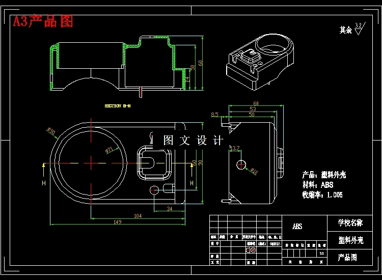 根据塑料制品的要求,了解塑件的用途,分析塑件的工艺性、尺寸精度等技术要求,选择塑件制件尺寸。本模具采用一模两腔,侧浇口进料,注射机采用海天160X2C型号,设置冷却系统,CAD和UG绘制二维总装图和零件图,选择模具合理的加工方法。附上说明书,系统地运用简要的文字,简明的示意图和和计算等分析塑件,从而作出合理的模具设计。 关键词:机械设计;模具设计;CAD绘制二维图;UG绘制3D图,注射机的选择