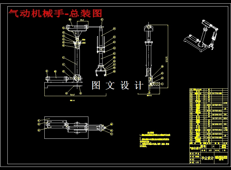 随着工业自动化发展的需要,自动化要求程度越来越高,机械手在工业应用中也越来越广泛。由于气动机械手有结构简单、无级调速、过载保护、复杂的动作等独特优点,大大的改善了工人的劳动条件,显著的提高了劳动生产率,气动机械手在工业、军事、航空、医疗、生活等领域得到了广泛的应用。基于PLC控制的机械手近年来更是得到广泛的推广。文章主要叙述了气动机械手的结构和控制系统的设计过程。 本文通过对机械手的组成和分类及其发展状况的了解,对本课题进行了总体方案设计。确定了机械手用三自由度和圆柱坐标形式。设计了机械手的夹持式手部结构和机械手的总体结构,以及机械手控制系统的设计,以实现机械手的伸缩、升降、回转、三个自由度及手抓的开合。 最后使用机械设计软件Pro/ENGINEER对机械手实现实体模型的建立和运动仿真。
