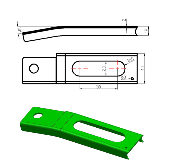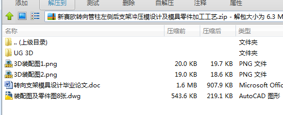 本次设计的零件为转向支架冲压,所用材料是 不锈钢。本论文分析了该工件的成形工艺,计算了该工件的毛坯形状尺寸及各工序尺寸,并在此基础上确定了合理的冲压工序,分为三 道工序分别为工序一落料折弯,工序二冲中间孔和腰型孔,工序三内外缘翻边。此方案的特点 是模具结构简单,制造成本低,操作方便,并且尺寸和精度达到工艺要求,具有良好的性价比。