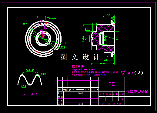 此零件为传动器主动齿轮,零件的材料为PE,零件的形状属于圆形结构,端面是齿形,分析零件的形状,选择外形最大面积处作为分型面,将浇口位置设计在侧面,选择一模两腔结构,设计两板模结构,要计算型腔尺寸和外形尺寸,然后选择标准模架,绘制模具图纸,选择合适的注塑机,并校核参数。