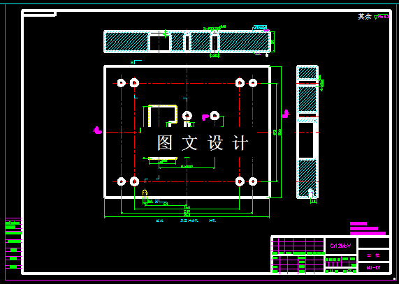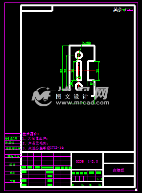 此安装板零件,是个平板,零件的外形由直线组合连接,内部有两个圆孔和长方孔,孔边的距离比较小,需要将冲孔工序和落料工序分开,但是这样就需要两套模具,因此将工序组合,设计成级进模,通过合理排样,计算模具的外形尺寸,然后绘制正装结构的模具图纸,以及重要的模具零件图。