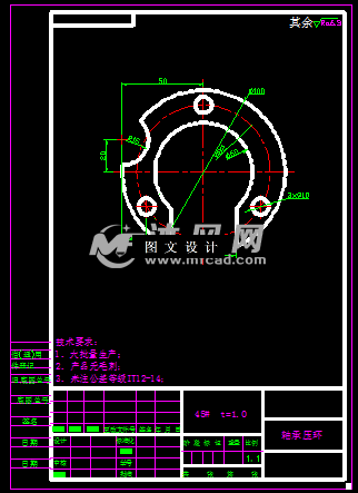 此轴承压环,是个平板结构零件,外形不规则,内部还有三个圆孔对称分布,由于生产量比较大,为了满足生产量的需求,设计多工位自动送料级进模,结合形状分析,以及尺寸的比较,设计排样结构,计算刃口尺寸,计算模具的外形尺寸,选择矩形钢板模架,并配合标准滑动导柱导套,设计其正装结构的模具,绘制模具装配图和零件图,计算压力大小,选择合适的压力机。