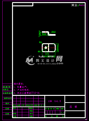 此压板零件,是个弯曲件,成Z形结构,单独设计弯曲模,模具结构不稳定,所生产的零件合格率也低,因此选择级进模,进行双排结构设计,既能提高生产效率,又能确保模具受力平衡,所设计的模具结构,采用正装形式,通过计算,设计出排样图,然后计算模具的尺寸,利用软件绘制模具图纸,包括装配图和零件图,再编辑计算过程和设计过程。