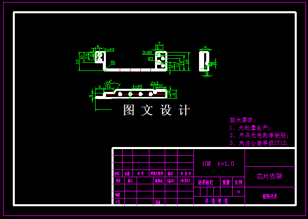 此芯片支架零件,是个多处弯曲的零件,通过对零件尺寸和形状的分析,冲压工艺的对比,确定采用多工位级进模生产,通过展开计算后,选择合适的搭边值,然后进行排样结构设计,最后计算模具的外形尺寸,选择矩形钢板模架,选择滑动导柱导套,绘制模具结构图和零件图,并计算所需要的压力,选择压力机。