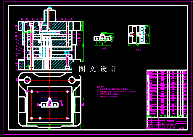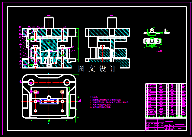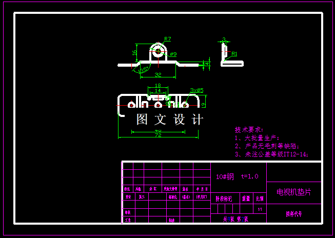 本次设计,是针对电视机垫片,进行工艺分析,选择合适的设计方案。零件的底面有弯曲,侧面还有单侧弯曲,侧面上还有翻孔,从工艺分析上看,落料和冲孔可以合并,底面和侧面的弯曲复合,侧面的翻孔单独设计一套,通过计算获得工件的展开尺寸,合理排样,设计排样图,结合工件的外形尺寸,计算出模具的外形尺寸,选择标准模架,绘制三套模具结构图和零件图。