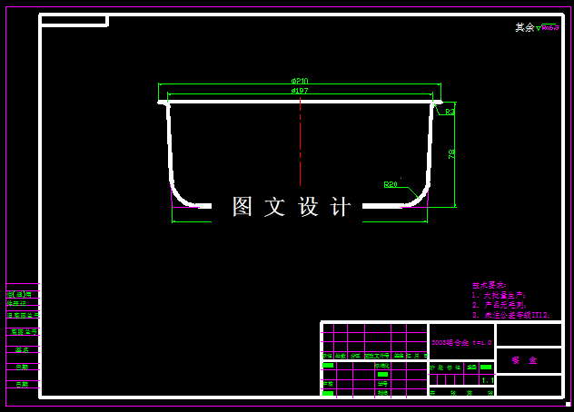 此蛋糕盒,是个圆形结构件,零件的形状简单,凸缘尺寸不大,但是工件的外形比较大,而且拉深高度也大,因此工艺分析之后,将落料和拉深工序分开,确定设计两套模具,然后详细计算出工件的展开图,并计算模具的刃口和外形尺寸,选择矩形钢板模架,绘制出模具结构图和零件图。