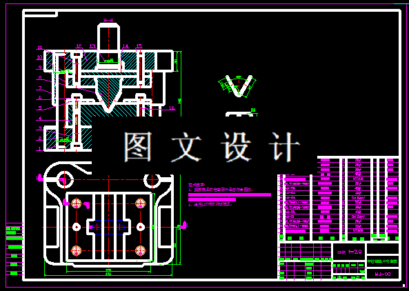 此中铰链垫片,是个V字形结构零件,零件的形状简单,侧面斜面上有圆孔,通过计算展开,确定展开的长度,绘制出工件的展开图,然后利用冲裁模具,进行板材的落料和冲孔,计算出搭边排样,设计排样图,绘制倒装结构的落料冲孔模,然后单独设计V形结构的弯曲模,绘制装配图和零件图。