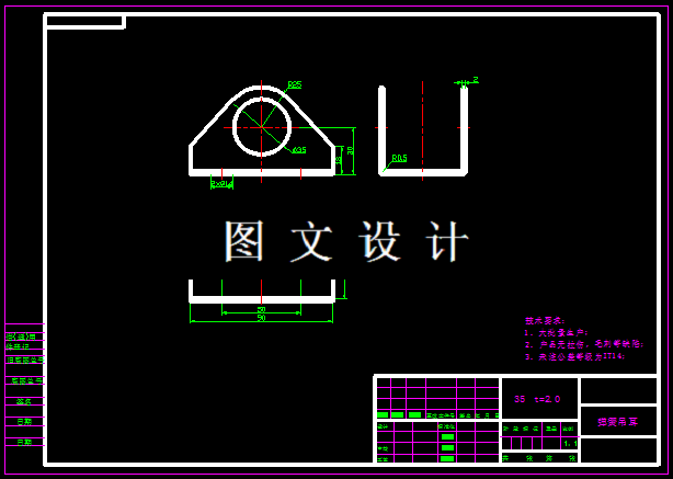 此弹簧吊耳,是个U形结构件,工件底面有圆孔,侧面还有圆孔,基本工序有落料,冲孔,弯曲,通过计算,孔边带外形的尺寸,满足复合模的要求,因此将落料和冲孔合并成一套模具,再单独设计弯曲模,计算出模具的各个尺寸后,绘制这两套模具的图纸,并计算两套模具的冲压力的大小,选择合适的压力机。
