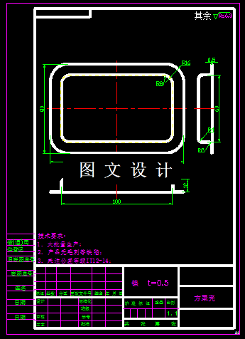 此方罩壳,是个矩形盒形件,典型的工序有拉深,在拉深之前,还有落料,然后通过切边工序,达到图纸所需的形状和尺寸,本次设计,通过详细计算,通过计算结果确定落料和拉深合并成一套模具,然后单独设计切边模,计算出模具的外形和刃口尺寸,绘制出模具结构图和零件图,并选择合适的压力机。