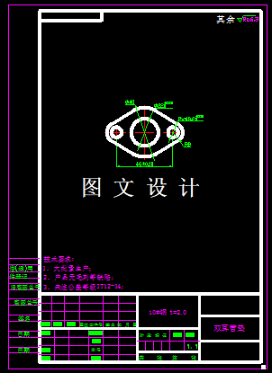 此双耳管垫零件,是个平板结构,外形成棱形,内部有圆孔,根据零件工艺分析,基本工序有落料和冲孔,根据任务要求,将这两个工序分开,分别设计落料模和冲孔模,通过计算出模具的外形尺寸和刃口尺寸,选择标准模架,绘制模具结构图和零件图。