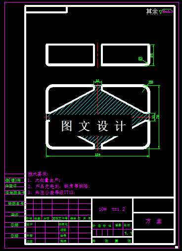 此零件两侧成型,圆弧过渡,通过工艺分析,将零件转化成四个零件,转变成一个盒形零件,通过拉深工序,达到盒形结构,然后通过切开工序,将一个盒形结构零件,冲压成四个零件,本次设计就是针对这个切开模具,进行设计和计算,绘制模具结构图和零件图,并计算出冲压力大小,选择合适的压力机。