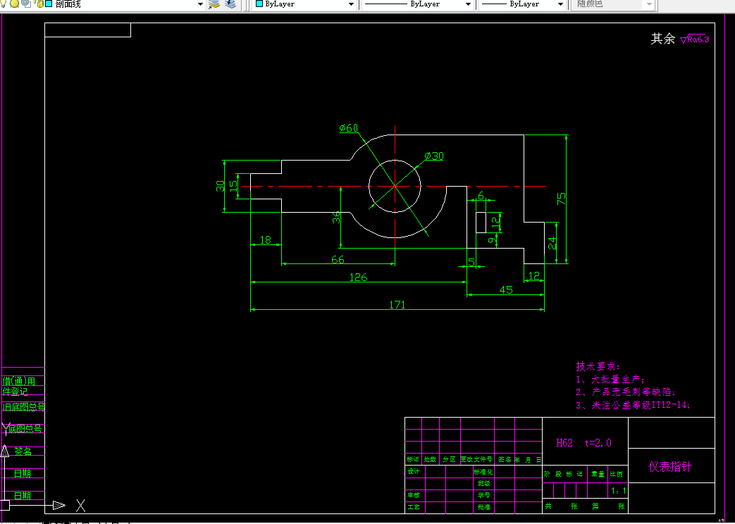 这次,是针对仪表指针的一个板件,进行冲压分析和设计,此零件比较常见,因此可以通过测量尺寸,获得零件图。设计此模具,首先要进行零件分析,确定冲压工艺,结合计算和查阅资料,算出排样尺寸,以及合理的排样方案。然后结合工序组合,选择合理的设计方案,查阅模具结构图,计算模具的各个尺寸和刃口尺寸,设计该零件的复合模,并选择合适的压力机,验证每个参数,最后利用软件,绘制出模具图纸。