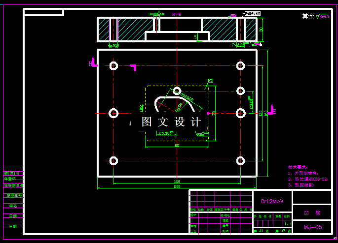 此双耳管垫的零件,是个菱形结构件,零件的形状容易理解,中间还有个大圆孔,为了提高材料利用率,在设计排样图时,将工件设计成斜排结构,再通过计算,获得模具的外形尺寸和刃口尺寸,设计其正装结构的复合模,并绘制模具各个零件的图纸。